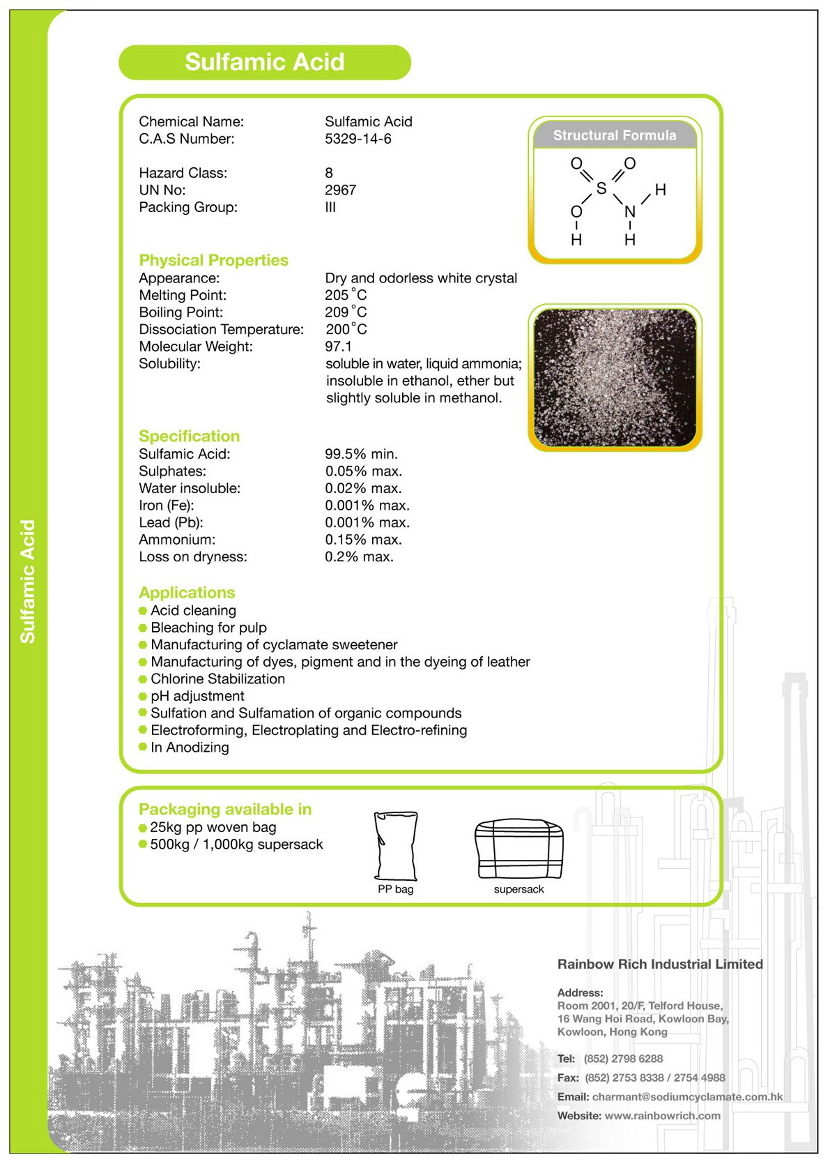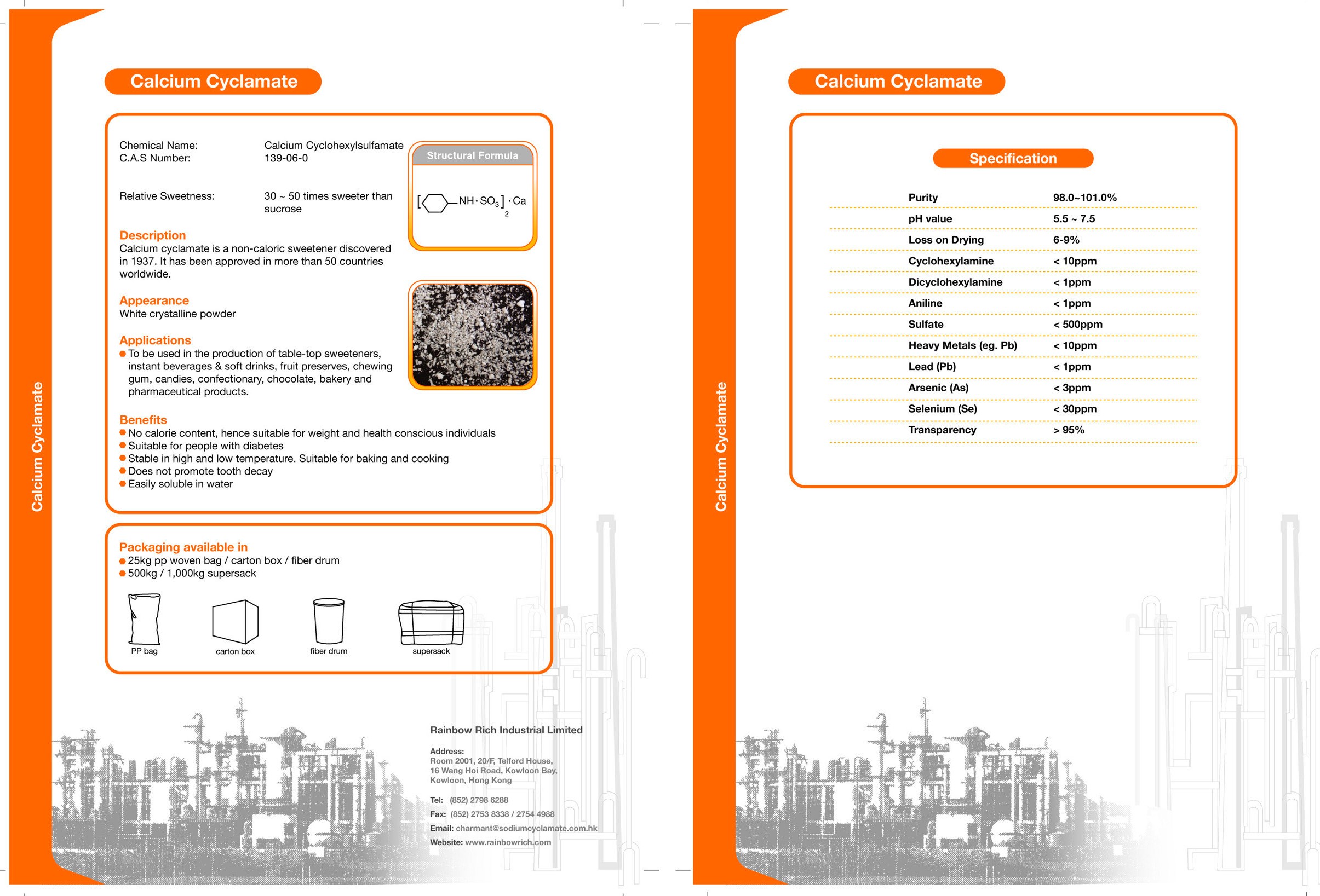 Safe for human consumption Contains zero calories Great for cold drinks productions, especially for fruit juices or soft drinks Massively used in canning, bottling, fruit processing Great additives in the food industry (e.g. barbecue food, vinegar manufacturing etc.) Utilize in the production of pharmaceuticals products (e.g. pills and capsule production), toothpaste, cosmetic and condiment (e.g. ketcup); High purity grade; Highly stable to heat, acid and alkaline conditions; Unlike sucrose which produces fermentation and bacterium effect, sodium cyclamate has a long expiration period